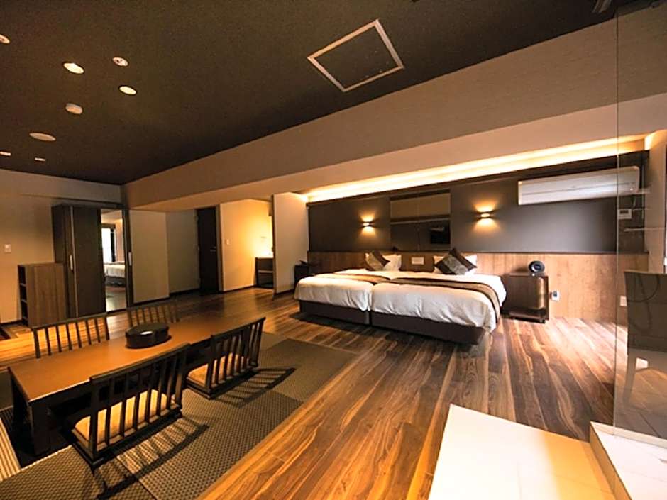 This suite features a private open-air bath. This spacious suite features 1 living room, 1 separate bedroom and 2 bathrooms with a bath and free toiletries. This suite has air conditioning, tatami, a flat-screen TV with satellite channels and a balcony. The unit has 3 beds.